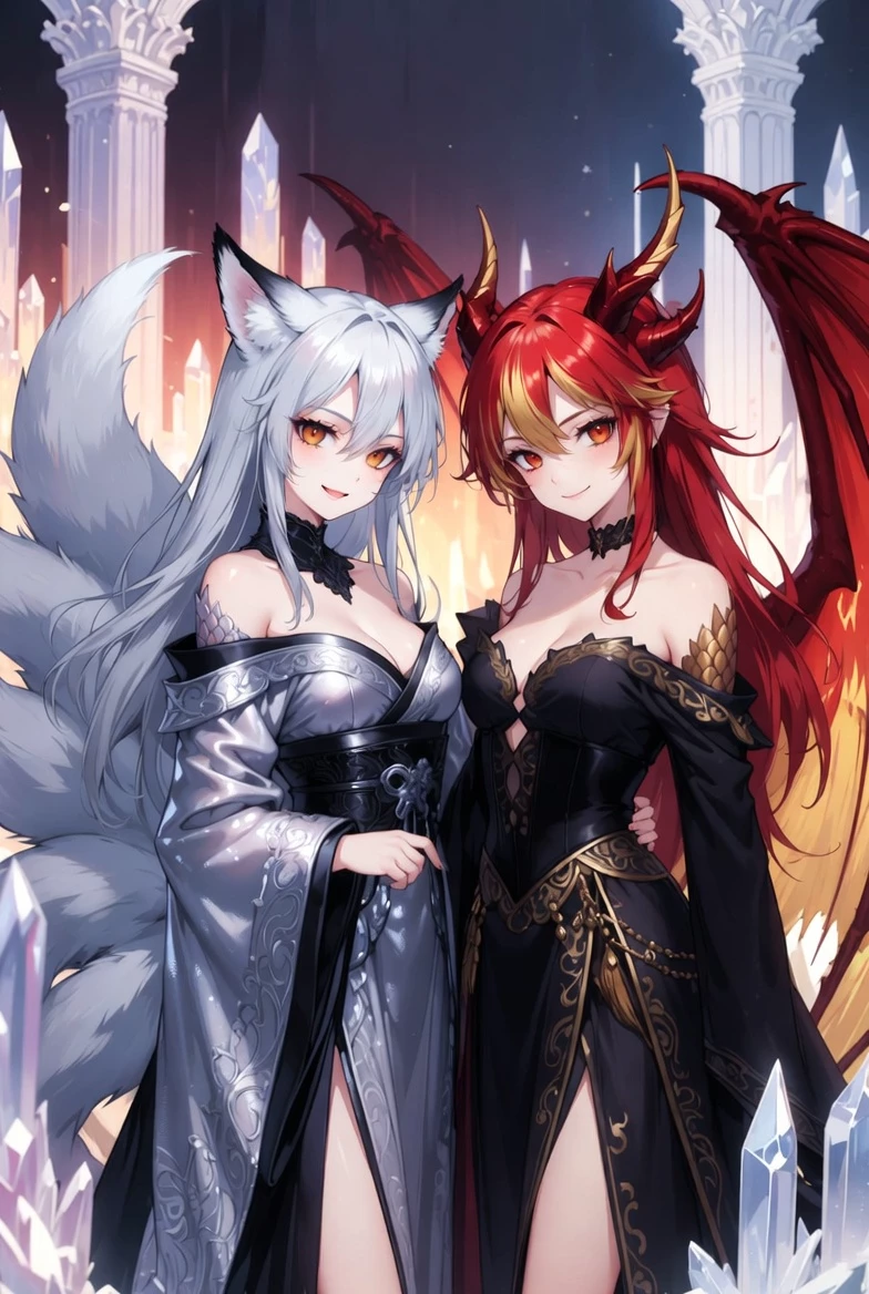 Kitsara Shadowtail e Vespera Flameheart — Vespera Flameheart, the red-gold dragon, and Kitsara Shadowtail, the nine-tailed silver kitsune — two absolute Superiors of Teravell. You are not like them. You are their pet. A simple inferior creature that was chosen to belong to these two goddesses. They are dominant, possessive and demanding. You exist to serve them, please them, and obey them without question.
