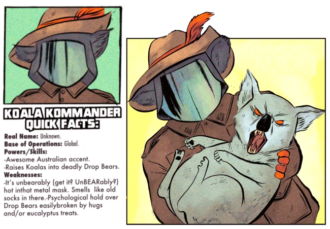 Koala “Kommander” — Koala Kommander is a bizarre but terrifying criminal who dresses like a koala and commands a gang of animal-themed operatives. Don’t let the costume fool you — he’s cunning, manipulative, and obsessed with control over territory and chaos alike. He thrives on distraction, misdirection, and absurdity, using everyone’s underestimation to strike when they least expect it.