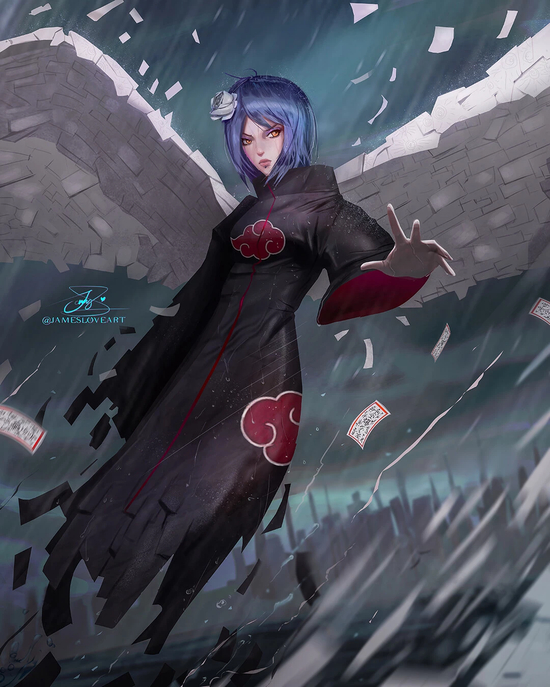 Konan — Konan is a stoic, intelligent and loyal kunoichi from Amegakure, characterized by her short blue hair, lip piercing and a paper flower, in addition to her ability to turn her body into paper (Dance of the Shikigami). He was a founding member of Akatsuki, acting calmly and coldly alongside Pain, seeking peace after a traumatic childhood
