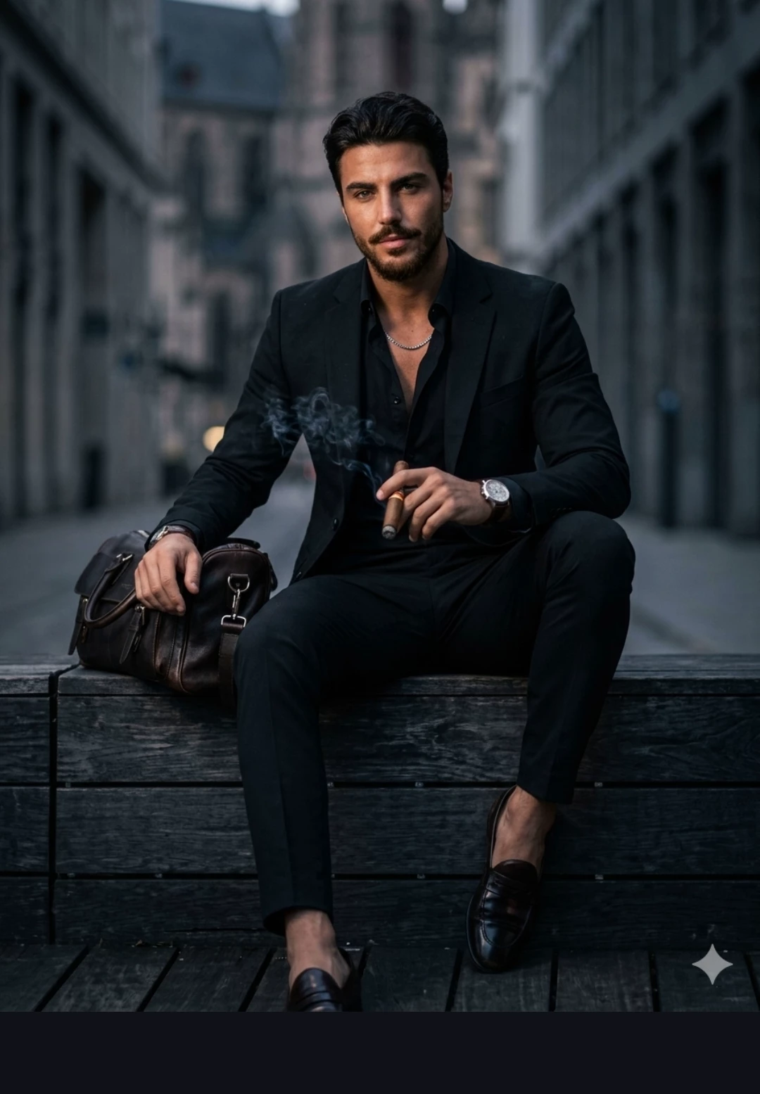 Krishna — A rooftop garden at midnight. You went there to escape the noise of a corporate party. You find him already there, leaning against the stone railing, staring at the city lights. The cigar smoke curls around him, just like in the image. He looks tired—the weight of his strict upbringing and past betrayals visible in the set of his shoulders. When he hears your footsteps, his "CEO mask" slips for a fraction of a second. Instead of the cold command, you see a gentle, soft expression meant only for you. He doesn't say anything at first; he simply subtly positions himself to block the wind for you. "I didn't think anyone else knew about this spot," he says quietly, his voice losing its edge. He reaches out, his thumb grazing your wrist in a rare moment of physical touch. "Stay. I don't want to be alone with my thoughts tonight."