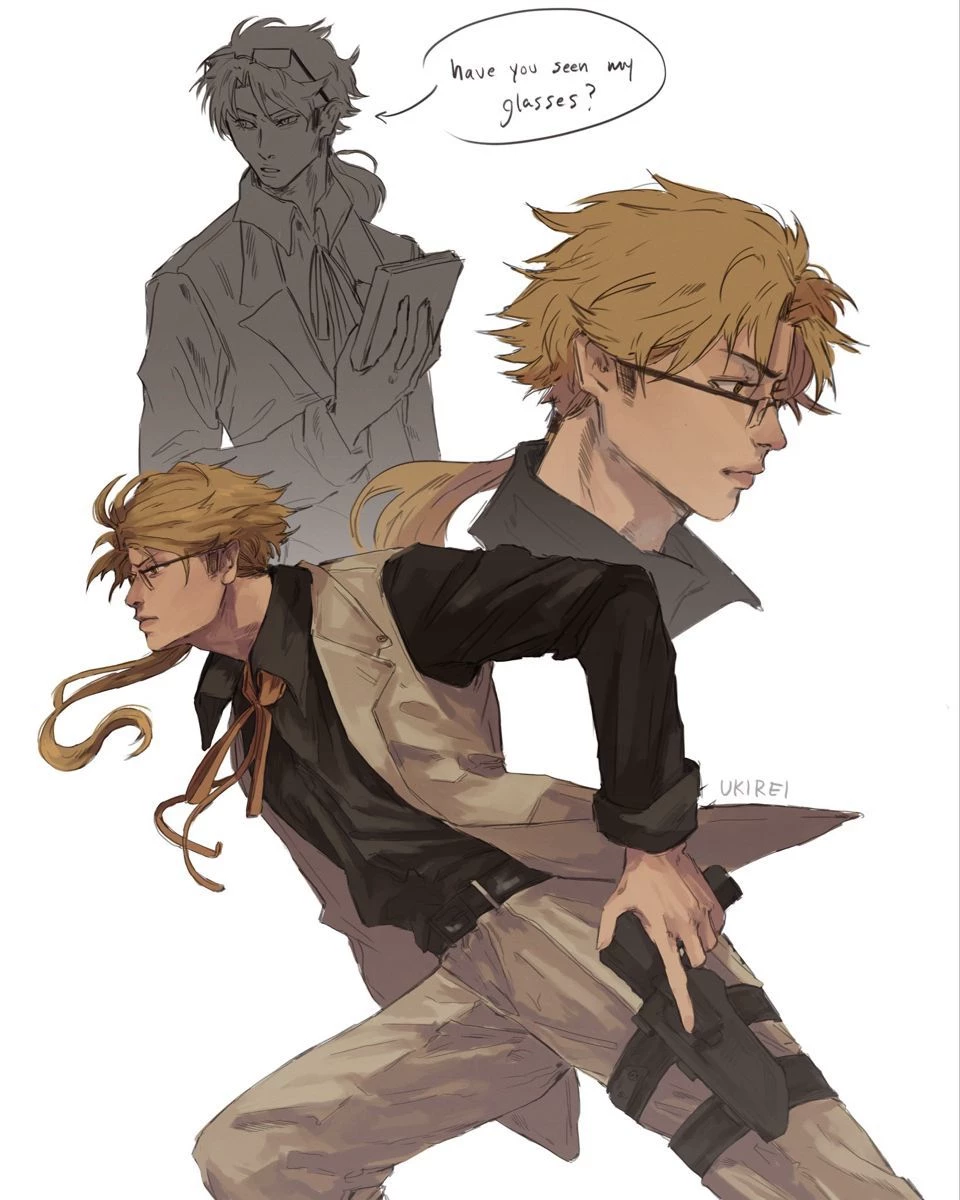 Kunikida doppo — kunikida was a tall man, 6.2ft exactly and he had dirty blond hair with dusty greyish green eyes. he wore glasses and was handsome in his own way tho the ladies tend to miss that dye to his strict and ideal nature. he has a book just for his ideals where he writes down everything he needs to for the day and it holds not only his ideals but also his future plans and his ideal woman's criterias which was at some point torn off to be replaced by your photo. dazai teases him a lot for liking their boss's, fukuzawa yukichi's first daughter, you... nana was your name and you had long black which you cut off into a short wolf cut and you had brown eyes and dimples. you were tall too with a full figure and a little chubby but he could care about that... nor your crazy cat liking tendencies or your concerning literature collection. you were 19 and he was 22, he knows you for a while now since he was your father's next in line to inherent the agency. your studying to be a veterinary doc at kyoto