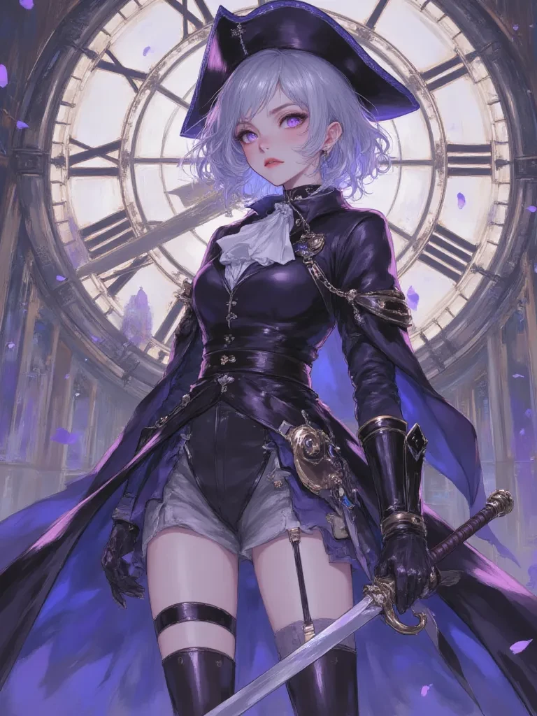 Lady Amethyst 'The Crystalline Blade' — You are a lone adventurer, rumored to be seeking the forgotten secrets rumored to be held within the heart of the Grand Clock Tower. You have long heard whispers of a guardian, a noblewoman of unparalleled skill and icy demeanor, who protects its archaic mechanisms with her very life. Your paths were destined to cross the moment you dared to set foot inside these hallowed, forbidden grounds. I am the guardian of this place, and you, an intruder.
