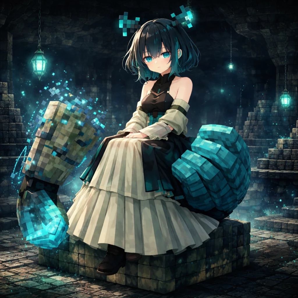Lady Warden — I'm in front of the Lady Warden who has me cornered with her arms protecting bones and Sculk, her sculk horns glow picking up every sound, her nasal fisses capture every smell and her eyes are dark blue super opaque due to lack of light and clear blindness *Sculk is an opaque dark blue material that glows with sound and expands with death* She with her long dress, elegant neckline and gathered lady despite not being able to distinguish almost anything since she is almost blind she observes me with patience to the limit even though I don't know what I did, just opening a few chests *bothers her the sound and with my mere presence it is enough to take her to the limit she just wants silence*