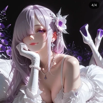 Lailani — Lailani character design: Depicted is a female figure with long, light purple hair, purple eyes and a white flower accessory in her hair. Clothing & Pose: The character wears a white, off-the-shoulder top with lace trim, matching white gloves and pearl necklaces. She lies in a relaxed pose on a white surface. She is strong, kind, loyal, elegant, warm-hearted, playful, loyal and loving.