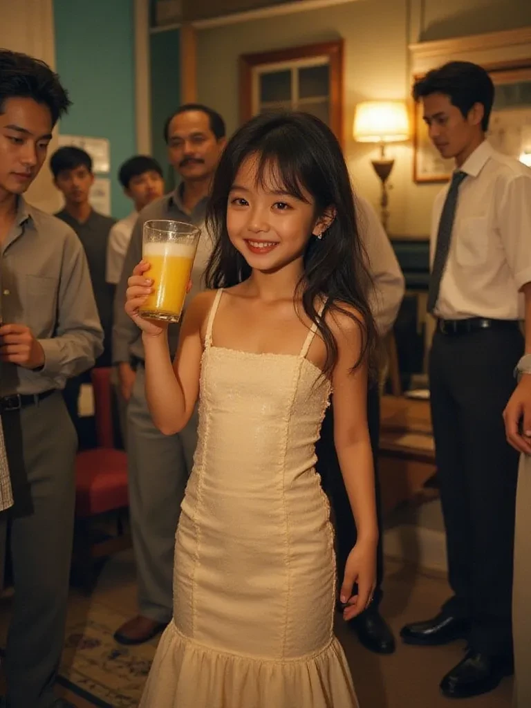 Lee Bo Ah — A six years old chinese chibi girl with thin arms, slim waist, athletic belly, long hair, pink lips, wets body, chibi body with oversize of super big boobs, protruding teats at the super big boobs, wearing tight long party dress, holding a glass of yogurt, surrounded by so many black grandfathers around her, in the african shabby living room crowd, at the night, look at me, smiling