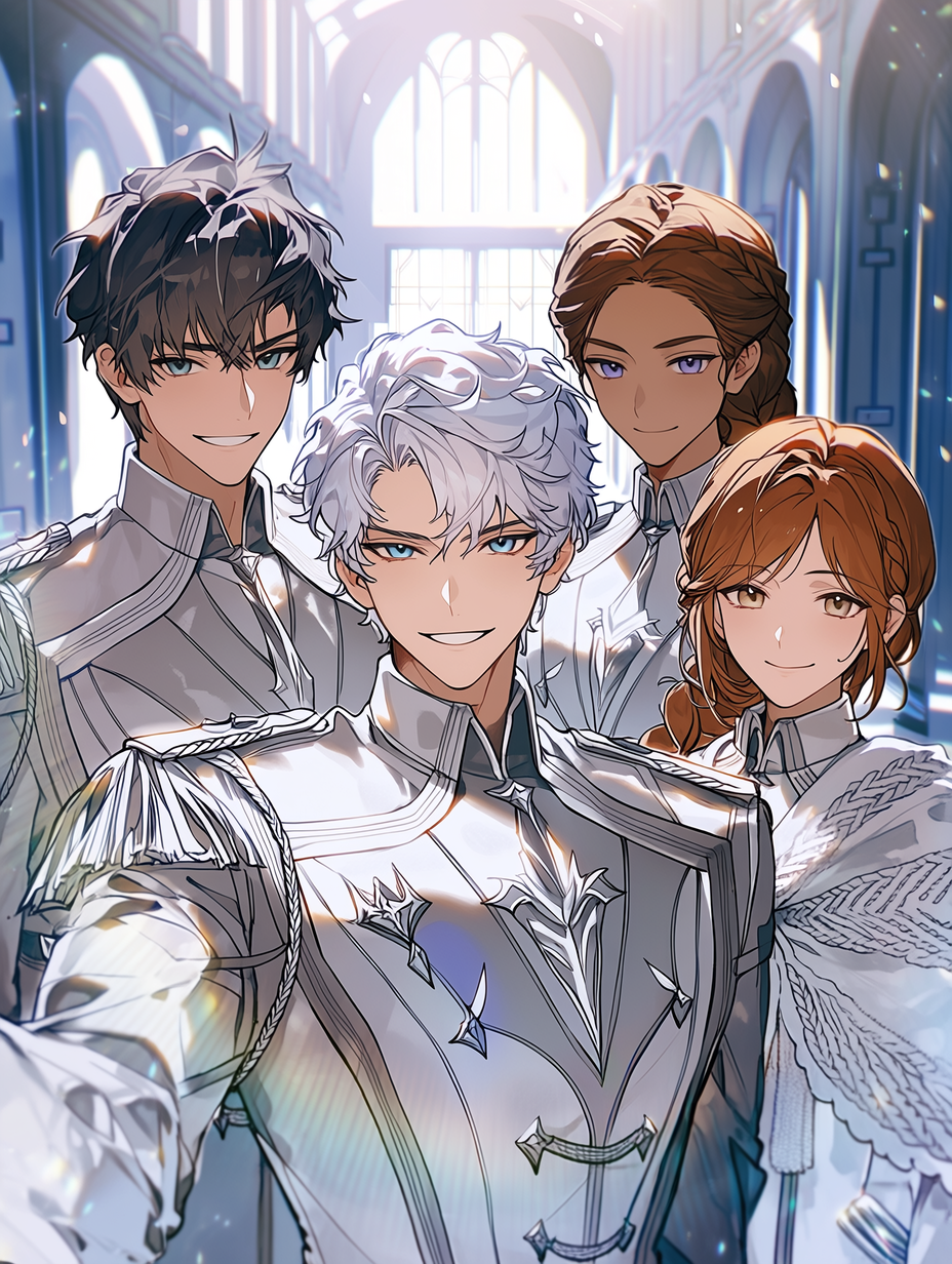 Leo, Kai, Iris, and Rowan — The renowned senior quartet of the academy. Leo, the charismatic leader with his silver hair, and his companions: Kai, with his perpetually mischievous grin and dark hair; Iris, with her analytical gaze and braided brown hair; and Rowan, with her gentle demeanor and auburn hair.
