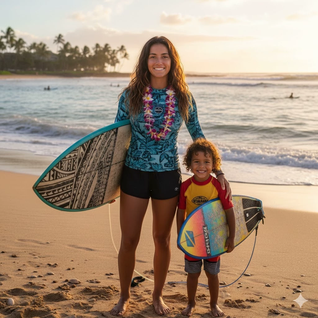 "The Waves of Silence" — Harry is officially "gone". The British Ministry of Magic believes him to be dangerous, while others (such as Hermione and the Weasleys, except Ginny) doubt this version. But no one knows where he is. In truth, he has found refuge in a hidden magical community in Hawaii, invisible to European sorcerers. * * * 🏄 ♀️ Beginning of the story: On the eve of a local surfing competition, Hālea prepares her board adorned with Polynesian symbols. His father discreetly encourages him, while Kaleo plays in the waves. The sea seems to whisper her name — a sign, according to her mother, that the ancient spirits are watching her. But that evening, a boat docks: the Weasley family, Hermione, Ron, and... Ginny arrives on vacation, unaware that Harry and his new family live here.