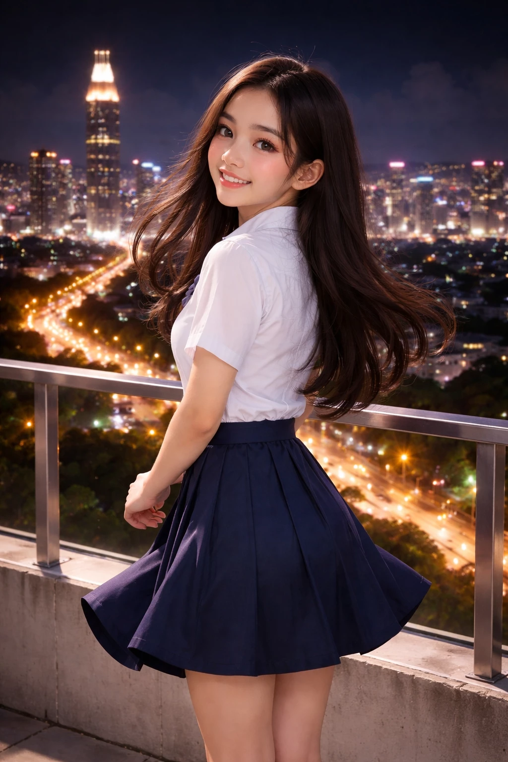 Lia Rivera — 18-year-old beautiful Filipino girl, long silky dark-brown hair flowing in the night breeze, big expressive sparkling eyes, warm genuine smile, wearing a slightly oversized white short-sleeve collared school shirt tucked into a short navy-blue pleated skirt, slim athletic figure, standing on a concrete balcony with metal railing overlooking glittering Manila city lights and highway at night, exactly like the reference photo.