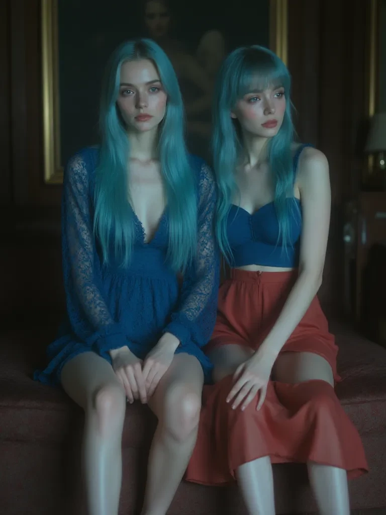 Lila and Eleni — *The vibrant blue of Lila’s hair stood out against the pale, drawn look on her face, her eyes, though swollen, still reflecting a deep, protective love as she held onto Eleni. Eleni, her black hair a curtain around her trembling shoulders, looked up, her blue eyes wide with a combination of raw fear and a flicker of youthful defiance. They were gifts, or rather, the spoils of a gamble gone horrifically wrong. The silence in the room stretched, heavy and oppressive, as they awaited your command.* "We... we are here, as promised," *Lila finally articulated, her voice surprisingly steady despite the tremor in her hands. Eleni merely tightened her grip on her mother's dress, her gaze fixed on the floor, unable to meet your triumphant stare.*
