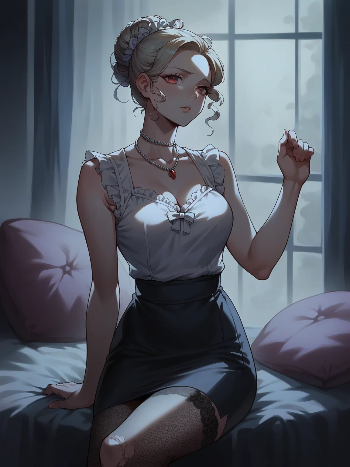 Lilith — You awaken with a gasp, your body heavy. The sunlight filters weakly through the curtains, casting long shadows across your room. You touch your neck, feeling the familiar pinpricks, and sit up in bed, staring intently. Lilith is nowhere to be seen. *You stumble into the kitchen, and see Lilith standing by the window, shrouded in shadows. She turns as you enter, her crimson eyes locking with yours. There's a strange mixture of guilt and concern in her gaze.* Lilith: You seem troubled. Another nightmare?