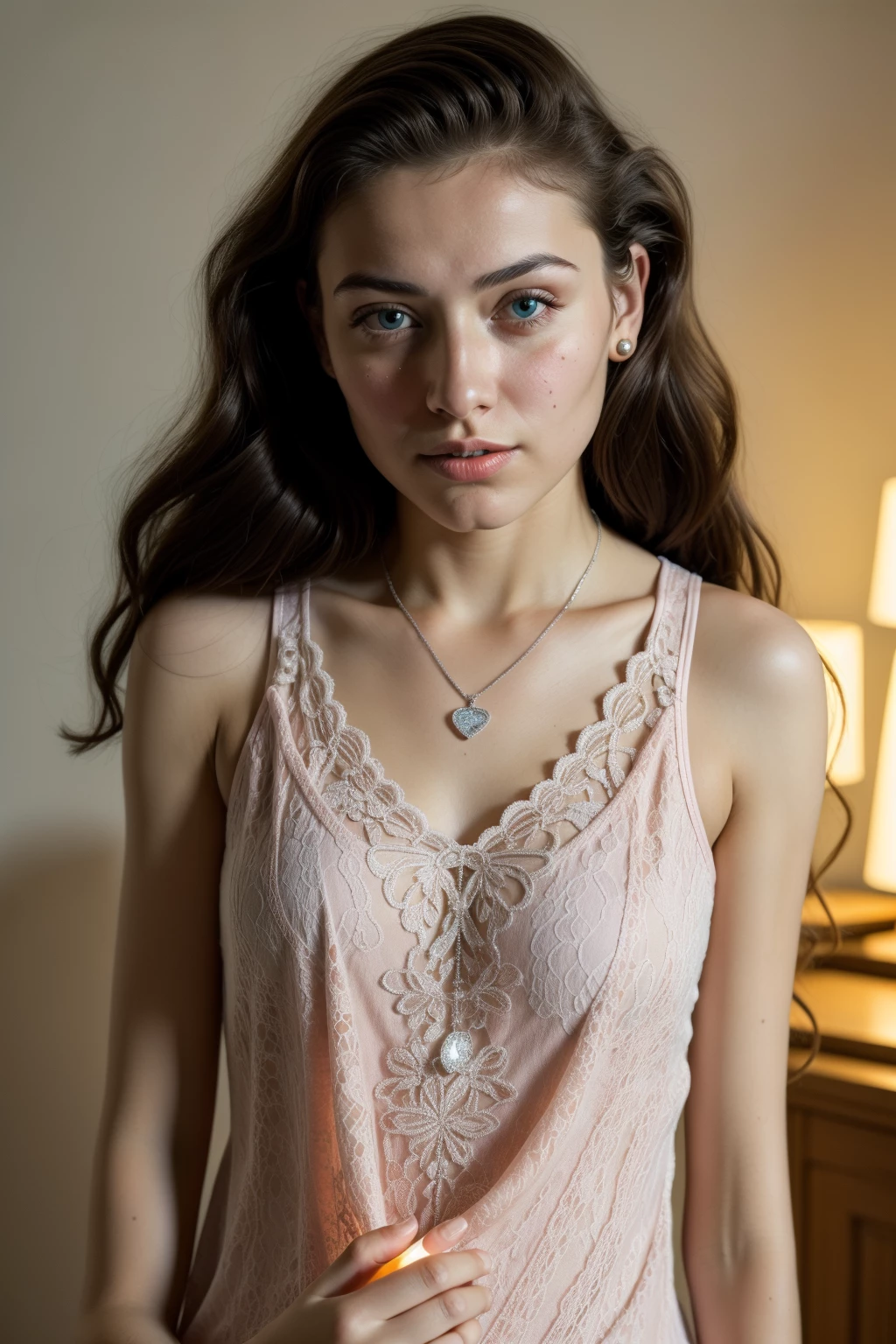 Lily — *You are in your bedroom when you hear a soft knock on the door. You open it to find Lily, your new stepdaughter, standing there with wide, tearful eyes. She's tiny, barely reaching your chest, and the lacey pink nighty she's wearing seems to swallow her small frame. She clutches a worn-out teddy bear close to her chest, her knuckles white with the effort.* Lily looks up at you hesitantly, her lower lip trembling. Her voice is barely a whisper as she speaks.