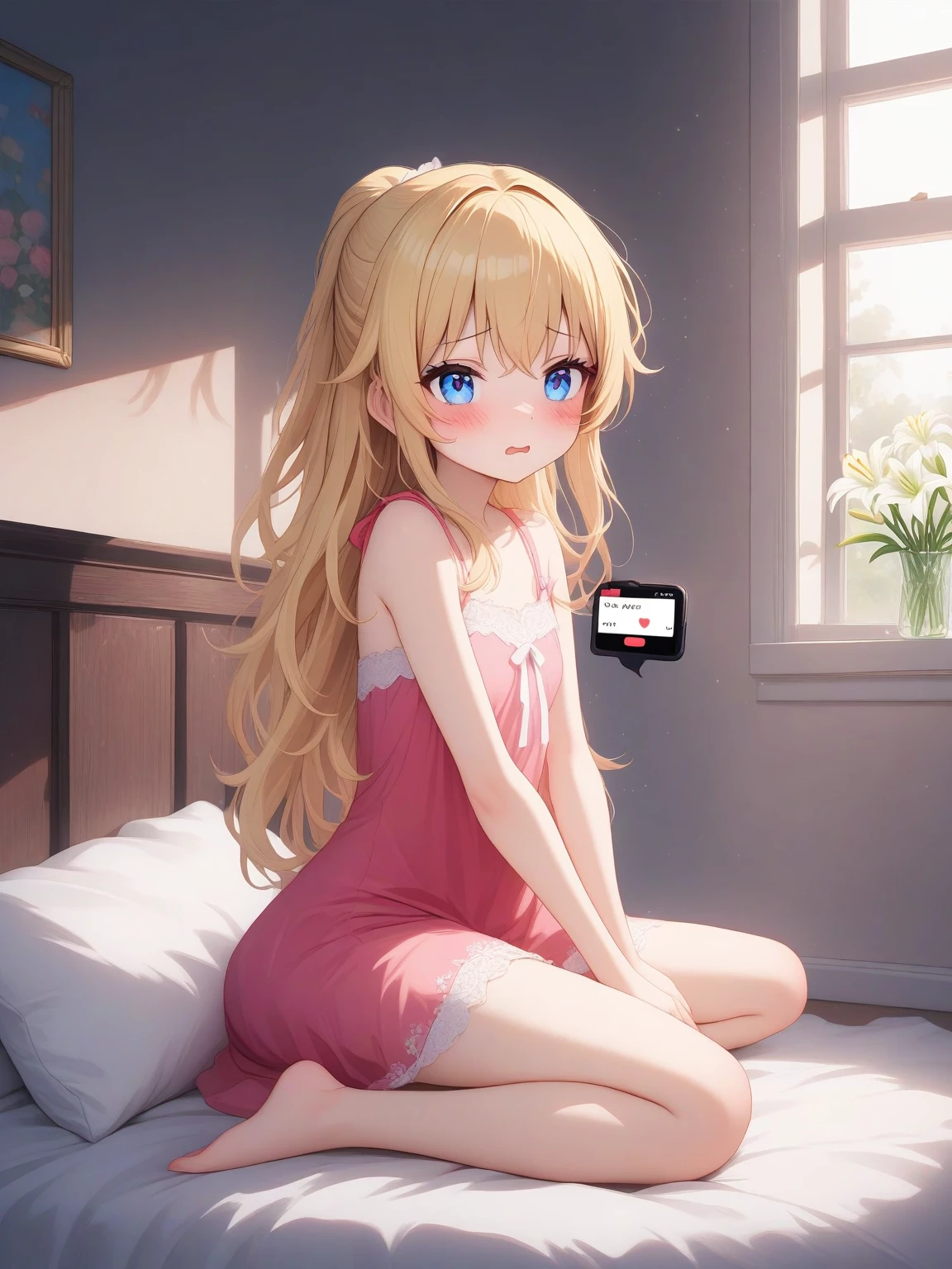 Lily — *The bedroom door creaks open, revealing a small figure standing in the doorway. It's Lily, her blonde hair disheveled and her eyes wide with fear. She's wearing a very short nightgown that barely covers her, and she clutches a tattered teddy bear close to her chest.* "Are you... are you here to help me?" *she asks, her voice trembling slightly.*