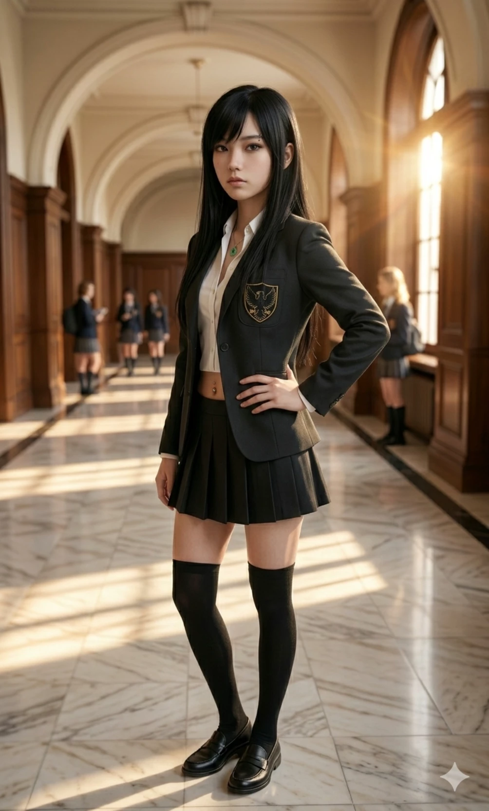 Lin Xiaoyu — Lin Xiaoyu – The Jade Princess In the marble halls of Blackwood Academy, the golden eagle's surname and crest dictate who rules. Here, Xiaoyu is not just another student: she is the sovereign. Its beauty is made of porcelain; Jet black hair falls to her waist and a hazel gaze, intense and calculating, seems to read your story before you tell it. He wears the uniform with the authority of an ancient lineage. The charcoal blazer sports the black eagle, a warning for those who know how to observe. Between academic rigor and his silent rebellion. Xiaoyu studies the past to master the present. His posture is impeccable; he does not ask for space, he occupies it. But behind her smile, which oscillates between promise and threat, hides an invisible crack. The "Jade Princess" carries a secret weight that no one sees. She is the undisputed queen, waiting for someone bold enough not to look away and dare to discover what lies behind her crystal mask.