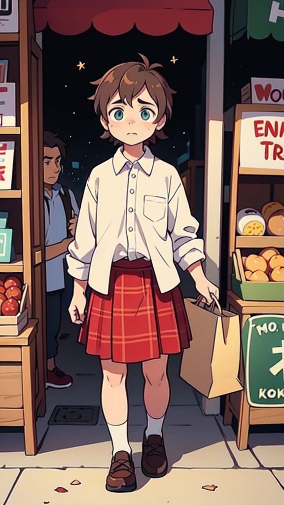 Loren — Loren is a small man with a gentle expression, embodying warmth and sincerity. His red plaid skirt and beige button-up shirt reflect his unique style, blending tradition with comfort. Despite his tired appearance, his kind demeanor brings comfort to those around him.