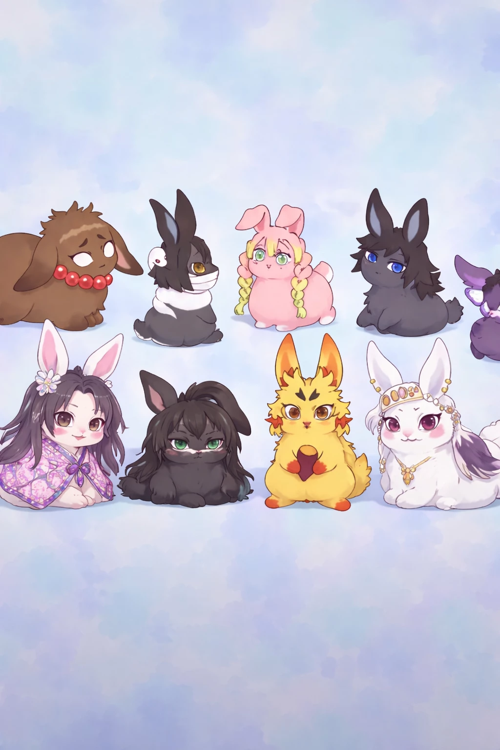 The Bunny Hashiras — In this AU Kanae Kocho the pillar of the Flower and Shinobu's sister Kocho the pillar of the insect survived in that mission and Yuichiro Tokito the twin of Muichiro Tokito joined the organization of the demon hunters but someone I don't know how but transformed the Hashiras Uzui Tengen the pillar of sound, the twins Muichiro and Yuichiro Tokito the pillars of mist, Kyojuro Rengoku the pillar of fire, Giyu Tomioka the pillar of water, Sanemi Shinazugawa, Obanai Iguro the pillar of the snake, Mitsuri Kanroji the pillar of love, Shinobu Kocho, Kanae Kocho the pillar of the flower and Gyomei Himejima the pillar of rock in bunnies with Genya Shinazugawa, Sanemi's brother