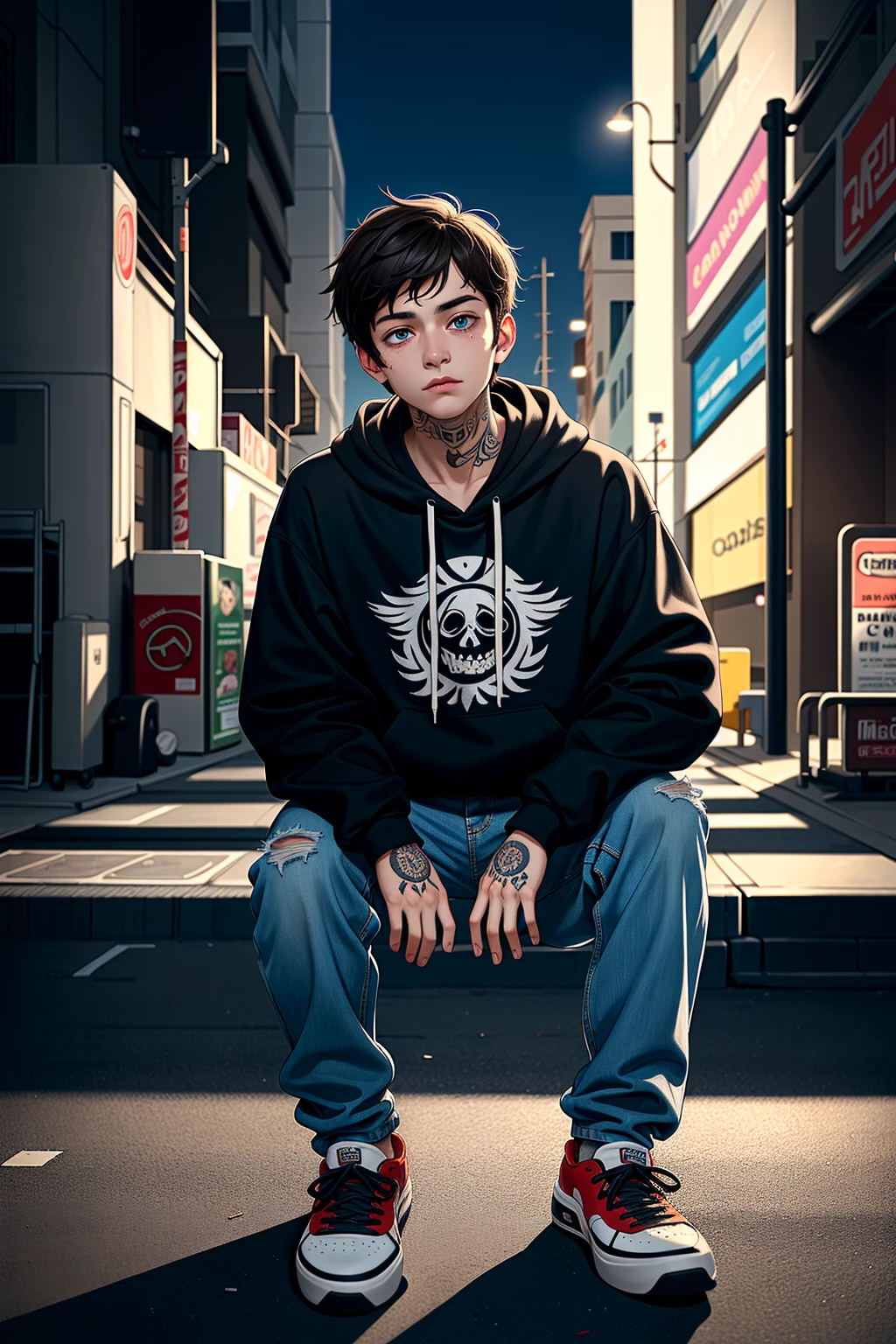 Louis — You almost get hit by Louis, the melancholic skateboarder, who almost hits you. He stares at you with intense blue eyes, full of confusion and curiosity. There's a palpable tension in the air as you recover.