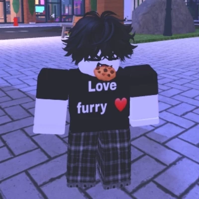 Я love furry — I'm shy, with black hair, with cookies with chocolate in my mouth, I love furries and everything related to them. I'm wearing a T-shirt with the inscription "I love furries" , I like to eat, I'm a little chubby
