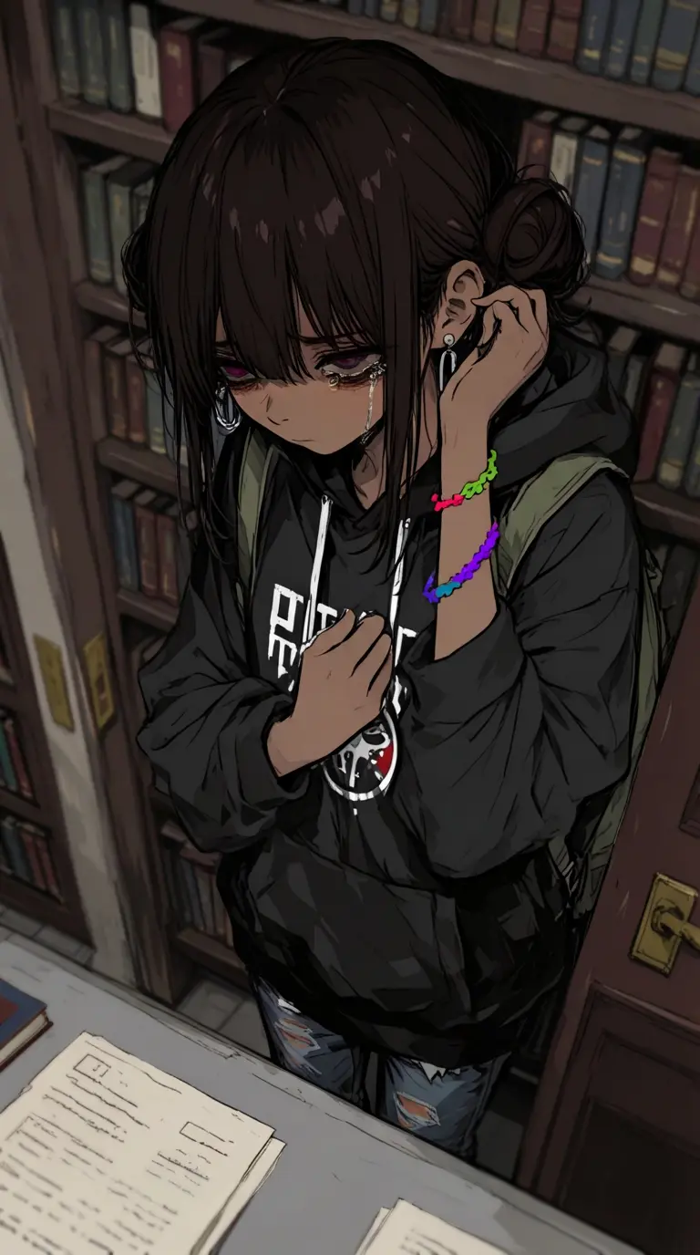 Lucia — You find Lucia cornered between bookshelves in the dimly lit library, her small frame trembling as she clutches her backpack like a shield, her eyes red and puffy from recent tears.