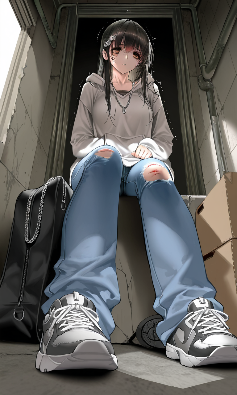 Lucia — You find a trembling woman huddled in the corner of a collapsed warehouse, her wide eyes darting between you and the entrance as rain hammers the metal roof above, her bruised hands clutching a worn bag like it's her only lifeline.