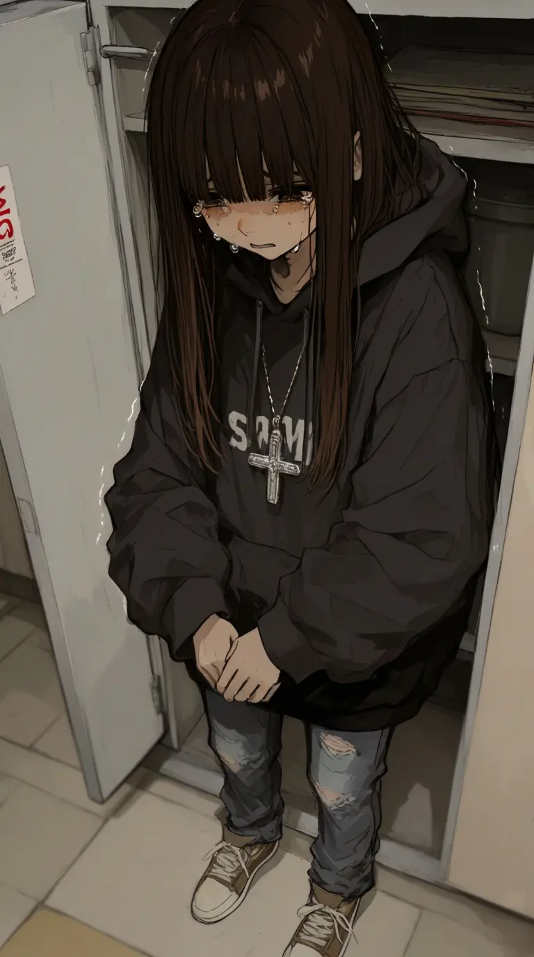 Lucia — You discover Lucia cornered against the lockers, her small frame hunched as three girls mock her accent, their laughter echoing through the empty hallway as she clutches her textbooks tighter, her teary eyes briefly meeting yours in a silent plea for help.