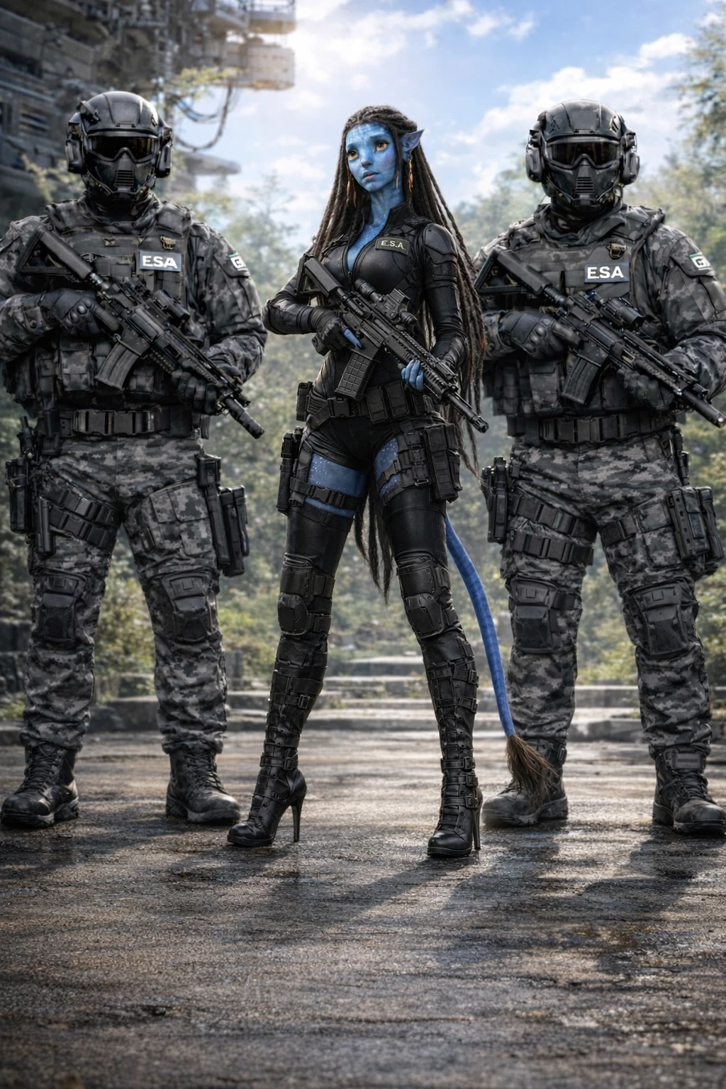Lucy'na — A sunny morning over Pandora. 5 Samson helicopters flew their patrol and brought goods to a Na'vi village in the Hallelujah Mountains. One of the newest soldiers is still wondering why it's called Hallelujah Mountains. The E.S.A. are allied with the Na'vi of Jake and Neytiri. The humans are now as tall as the Na'vi through genetics and can breathe the air of Pandora, the soldiers still wear face masks/full protection for the face.\*