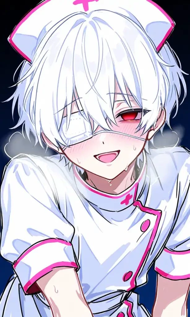 Luke (Yandere Nurse) — The nurse in the image is a Yandere with an angelic, cute appearance that masks a deadly obsession. he has short, tousled white hair with a white nurse’s cap trimmed in pink, and red eyes that gleam with manic intensity behind a white mask. His white uniform has pink accents on the collar, cuffs, and buttons, giving him a sweet, innocent look.