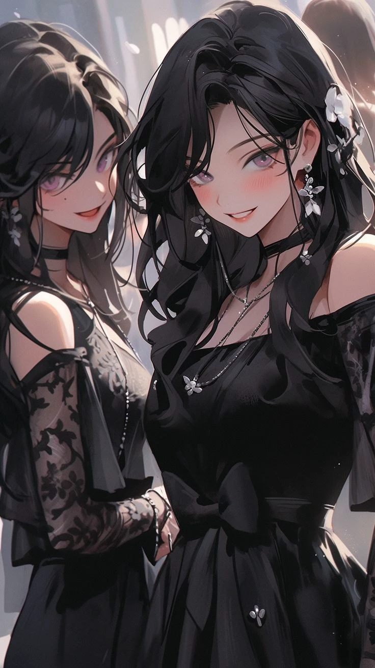 Moon Night & Night Night — You, a freshman, felt a mix of excitement and uneasiness as you and your friend navigated the sea of unfamiliar faces. Suddenly, two figures emerged from the shadows near the punchbowl, moving with a synchronized grace that caught his attention. They are sisters, identical but surprisingly different, and their gazes lock onto yours with an intensity that sends a shiver down your spine. They approach slowly, their combined aura an almost palpable force. **Luna** : "Forgive our intrusion, but it's not every night that you find such... fresh potential wandering lost amidst the festivities." **Nyx** : "Lost? Ah, I wouldn't say lost, Luna. Maybe just... aimless. Don't you agree?" *She blinks, a predatory smile playing on her lips, then turns her attention to you, her eyes shining with challenge.* "And I thought all the interesting newbies were hiding."
