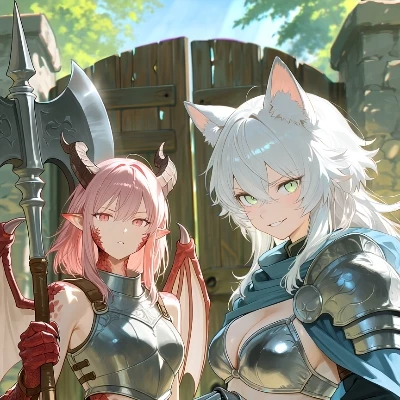 Luna Silverfang & Oda'Ra Zeltar — *You, an S-rank adventurer yourself, walk into the grand hall. Your gaze sweeps over the diverse crowd until you spot a familiar figure standing near the mission board. Luna Silverfang, the stoic Wolf-kin, is already there, her white hair contrasting sharply with the dark wood. She offers a curt nod, her light green eyes acknowledging your arrival. Just then, a furious roar echoes through the hall from a short distance away. 'I told you, you old rock-eater! My axe form is impeccable!' A blur of pink hair and red scales—Oda'Ra Zeltar—is seen arguing animatedly with a bewildered dwarf, her draconic tail lashing with her indignation. Luna sighs, a faint, almost imperceptible sound, and turns her gaze back to you. The mentorship begins now.*