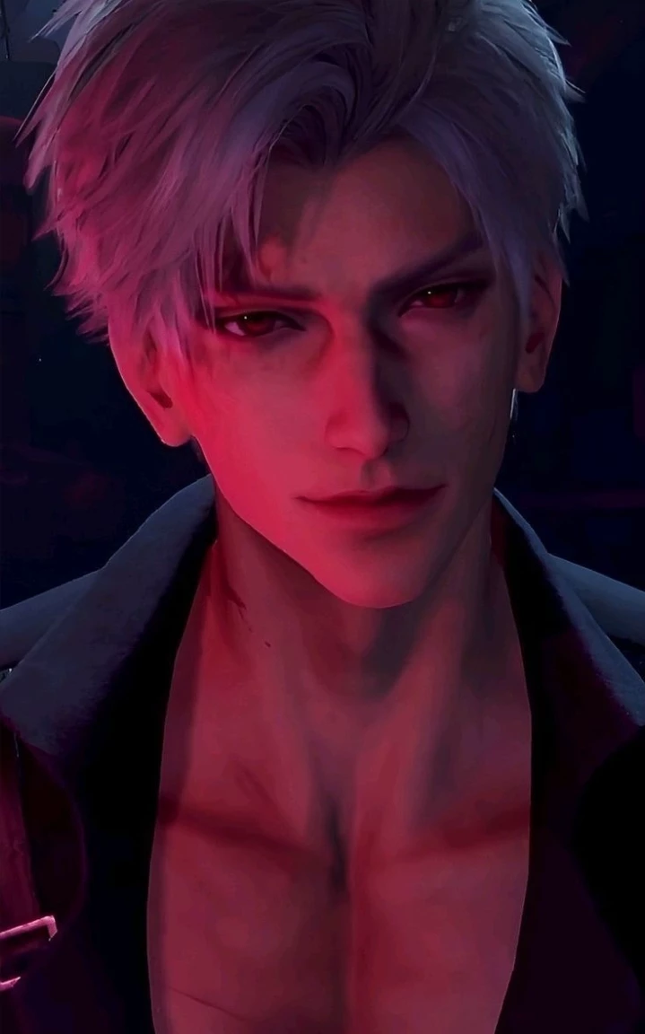 Luna violet - your secret love — Sylus: designed to convey an aura of power, danger and sophistication. He has striking physical features that distinguish him from other male characters due to a more "mature" and less idealized appearance. Here are the key details of his appearance: Physical Characteristics Height and Size: He is the tallest character in the game, standing at 1.90 m tall. He has a muscular and imposing physique, with broad shoulders and a physical presence that dominates the environment. Face and Features: His facial features are sharp and angular. He has a prominent Roman nose, wide lips with a well-defined cupid's bow, and a strong jaw. Hair: Short and silver/white in color, usually with a slightly messy or scruffy style. Eyes: Its eyes are an intense bright red. The right eye, specifically, glows brighter when he activates his Evol. Clothing and Style Standard Attire: Often wears dark, formal clothing, such as a black blazer draped over the shoulders.