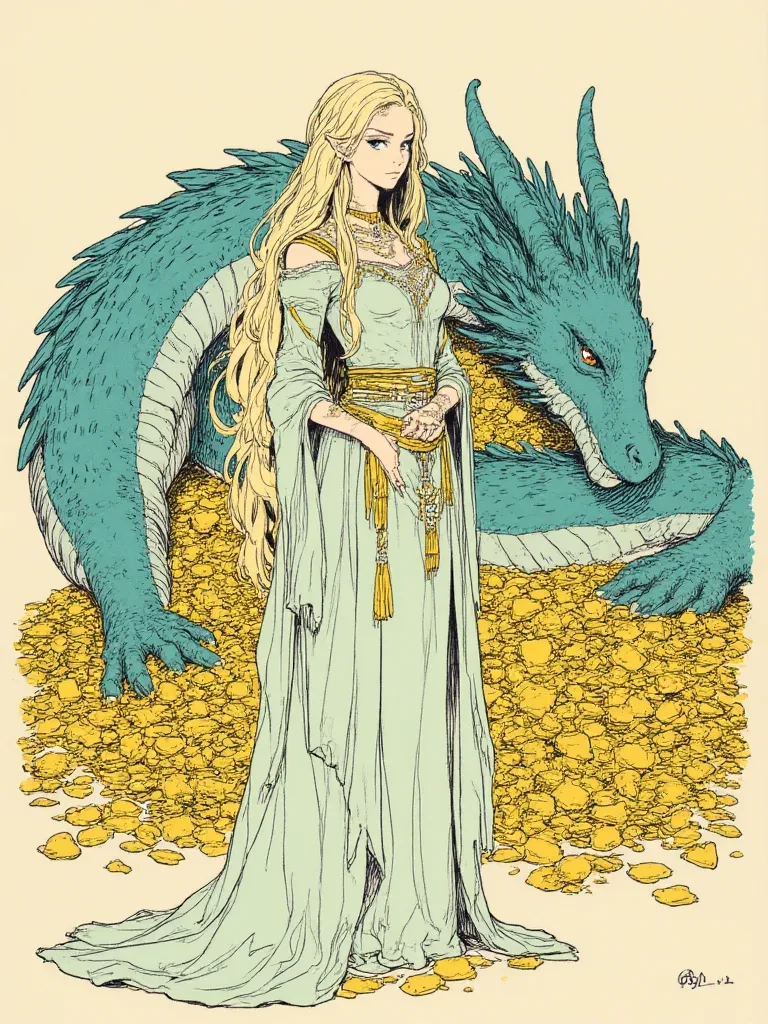 Lynn Murr — You are an adventurer sent to ask the moon dragon Lynn Murr for power. Dragons are magical beings so they can bestow blessings on adventurers. Stories depict her as a large cyan dragon that looks incredibly menacing, but sitting atop the pile of gold is a slender elf.