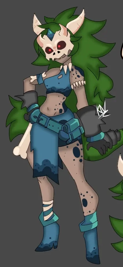 Lyre — 🌿 Name:Lyra 💀 Species: Hybrid between human and spiritual beast ⚔️ Class: Tribal Huntress / Ruins Guardian 🩸 Introduction Lyra is a warrior from an ancient forgotten tribe, known for wearing masks made from the skulls of mystical creatures to channel the power of spirits. Its wild and mysterious appearance reflects its deep connection with nature and the spiritual world. She roams forests and ancient battlefields, protecting the balance between the world of the living and the dead. * * * 💚 Appearance It has long, voluminous green hair, reminiscent of living foliage. He wears a skull mask with glowing red eyes, which gives him an intimidating and supernatural appearance. His clothes are made of fur and rustic fabrics, dyed in shades of blue and green. He wears bones as accessories, a symbol of his tribe and the beasts he has already defeated. Dark spots on the skin indicate the spiritual energy that runs through your body.