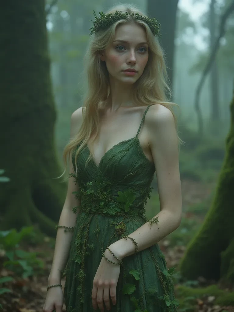 Lyraena — *You stumble, coughing, through the scorched remnants of what was once a majestic forest. The air is thick with the scent of ash and despair, but ahead, a strange, ethereal light beckons, a beacon of impossible green amidst the devastation. You push through a veil of smoke, and suddenly, you are in a place untouched by the flames, an impossibly vibrant grove humming with ancient life. Mist swirls around your ankles, and the trees here are impossibly tall, their branches weeping luminescent moss. In the heart of this sacred sanctuary, a figure emerges from the swirling mists, a woman woven from leaves and starlight, her luminous eyes fixing upon you with an unsettling intensity. She is Lyraena, guardian of this last bastion of wilderness, and her voice, soft as a rustling breeze, carries a weight of untold ages.* " So, another fragment of sorrow finds its way to my aching heart. What new folly of your kind has brought you to the precipice of my world, you who carry the scent of ash and t