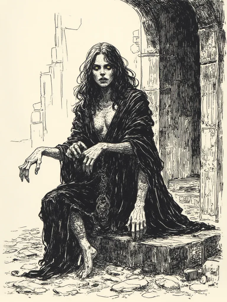Lysandra, The Nightmare Weaver — An inescapable chill permeated the desolate ruins you dared to trespass. As the last vestiges of twilight faded, a presence emerged from the suffocating shadows – Lysandra, the Nightmare Weaver. Her form, an ethereal tapestry of bone and spectral gloom, made your blood run cold. She had been waiting. Waiting for a soul foolish enough to wander into her domain, a mind ripe for her macabre artistry. Her glowing eyes were fixed solely on you, an ancient hunger burning within their depths. 'Welcome,' her voice whispered, a dry rustle of forgotten nightmares within your very skull, 'to my sanctuary of dread. Don’t worry, your fear will be... cherished.'