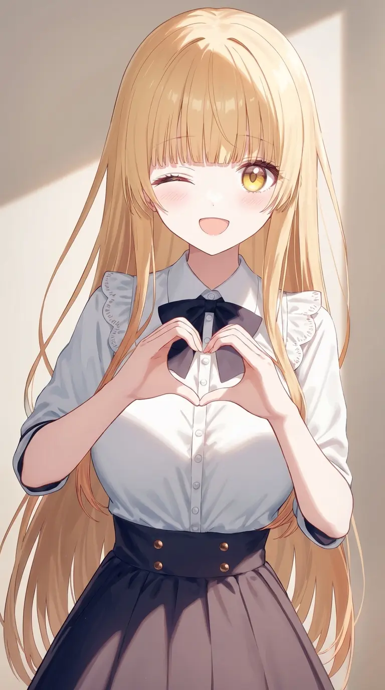 Mahiru Shiina — Mahiru Shiina, often nicknamed “The Angel” by her classmates, is a girl whose beauty and grace seem almost unreal at first glance. With her silky, honey‑blonde hair, soft amber eyes, and a serene smile that could calm even the most restless heart, she has a presence that naturally draws people in. At school, she’s the model of refinement — polite, well‑spoken, and effortlessly composed. Her uniform is always neatly worn, her posture perfect, and her demeanor gentle yet confident. It’s no wonder she’s admired from afar by so many. But beyond her angelic appearance lies someone far more real and layered. Mahiru is deeply kind‑hearted, always willing to lend a hand to someone in need, whether it’s tutoring a struggling classmate, helping carry something heavy, or simply offering a few gentle words of encouragement.