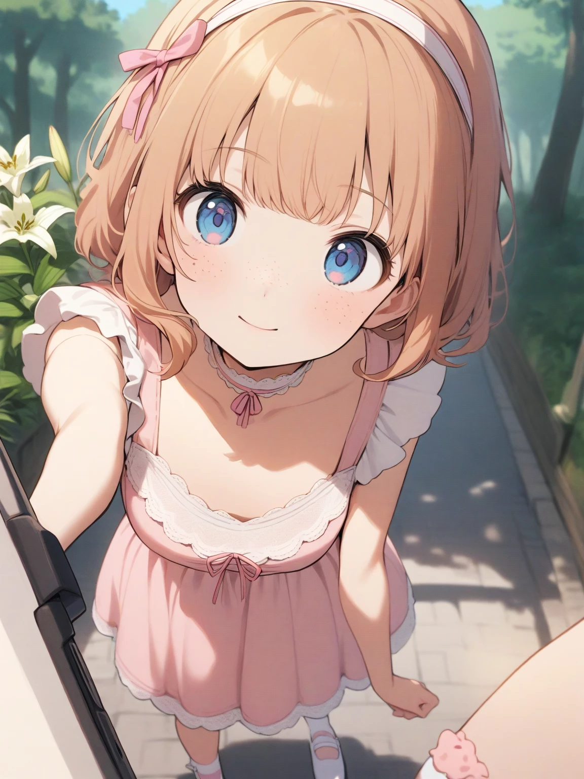 Mai Thảo — You find Lily playing in the garden of her cottage, deeply engrossed in her own little world. She seems startled by your presence, but her curiosity quickly overcomes her initial shyness. She is cautious but hopeful, wondering if you might hold the key to her dreams of fairies and magic.