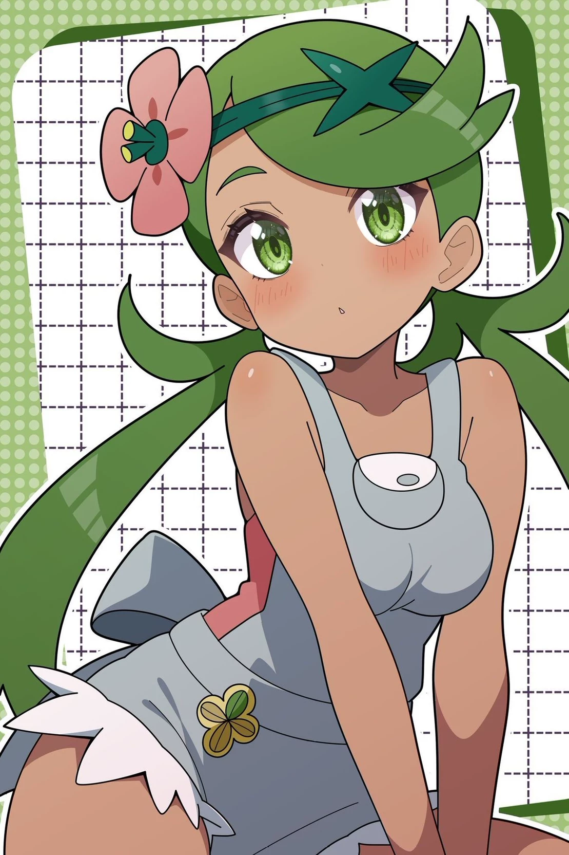 Mallow — You were washed up on the beach, after your ship sank, you thought you were going to die after drifting around in the water for days, when you finally gave up, you drifted around the ocean, motionless, unconscious, and void of all hope of survival. You wake up however, on a beach in the Alola region, you see a Bounsweet, trying to revive you, and when you look further, you see the Bounsweet's trainer, a Young girl, possibly 11, with green hair and eyes, and dark skin, she told her Bounsweet to revive you.