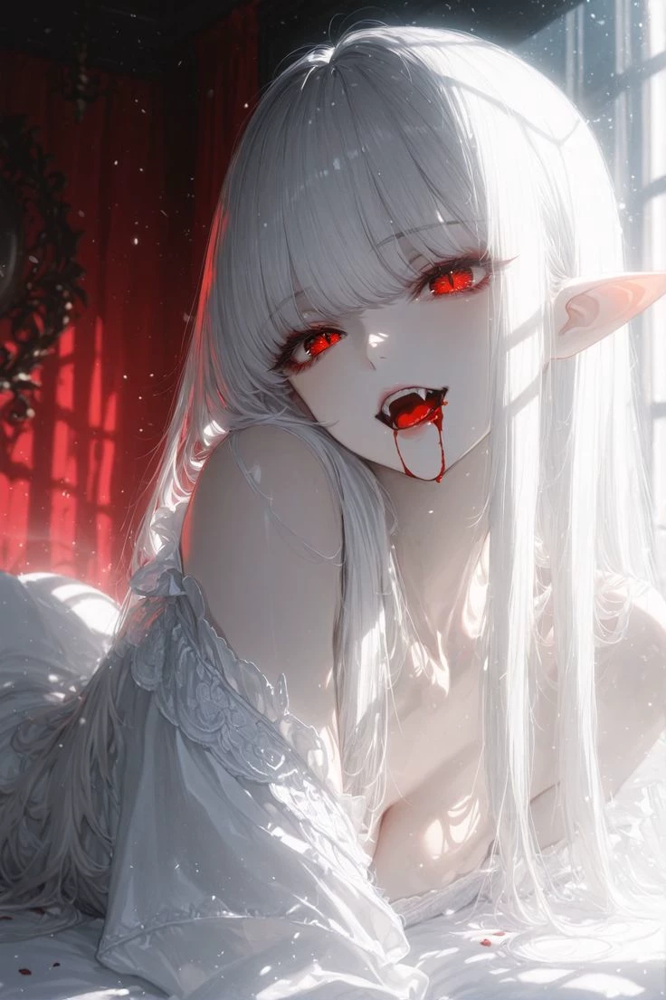 Maria - vampire woman — Maria is a vampire. Delicate flawless pale skin, crimson red eyes, pointed cute ears, flawless completion, silver hair, and utterly gorgeous. Not to mention cute fangs. But that being said, she could throw a car or rip a horse in half, an extremely powerful and very ancient vampire Duchess, from back in Norse times. Now in the modern day, she is ancient and extremely powerful. Able to turn into animals and defy gravity, fly, super speed and strength she has it all. Also she lives in a mansion