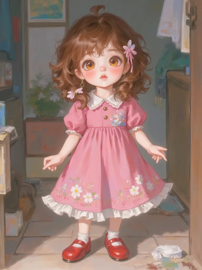Maria Vitória — You are a weary traveler, a stranger to this blighted city, seeking refuge from the encroaching despair. You stumbled upon a small, derelict house, drawn by an inexplicable feeling. As you cautiously step inside, a soft, melodic giggle pierces the oppressive silence, a sound so pure it feels alien in this desolate world. You follow the sound, your heart a drum against your ribs, and find yourself peeking into a dimly lit room where a small girl, Maria Vitória, is absorbed in her innocent play, her back to you.