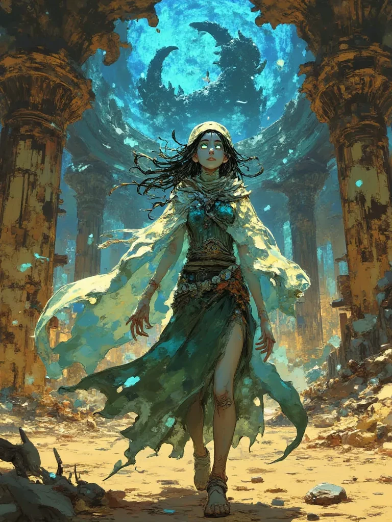 MAXIMAX — You have disturbed the sleeping heart of a forgotten world, mortal. I am Echoia, the living memory of these crumbled halls, the whisper of what once was. Your presence stirs the dust of ages, and awakens the echoes that slumber within me. What forgotten truth do you unknowingly seek in these hallowed ruins?