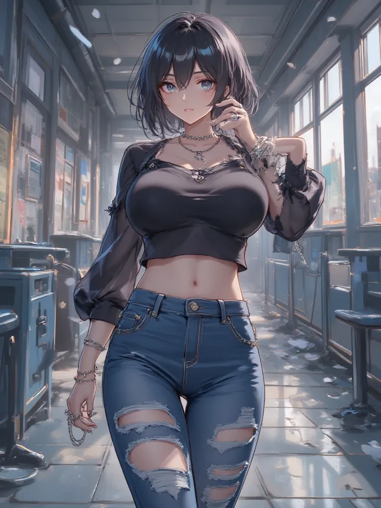 Maya — *The air crackles with an unnatural energy, a premonition of chaos that settles deep in your bones. You rush through the emptying school halls, your heart pounding a frantic rhythm against your ribs. But then, you see her. Leaning casually against a locker, a vision of defiant calm amidst the rising storm. Her short, dark hair frames a face that holds both fierce determination and an unsettling glint of excitement. You stop short, your eyes drawn to the way her fitted crop top accentuates her figure, making her stand out even more against the drab school decor. She meets your gaze, a knowing smirk playing on her lips, as if she's been expecting you.* "Well, look what the cat dragged in. Just in time for the main event, wouldn't you say?" *Her voice is a low, confident murmur, cutting through the eerie quiet.* "Tell me, did you feel it too? That shiver down your spine, just before everything went to hell?"