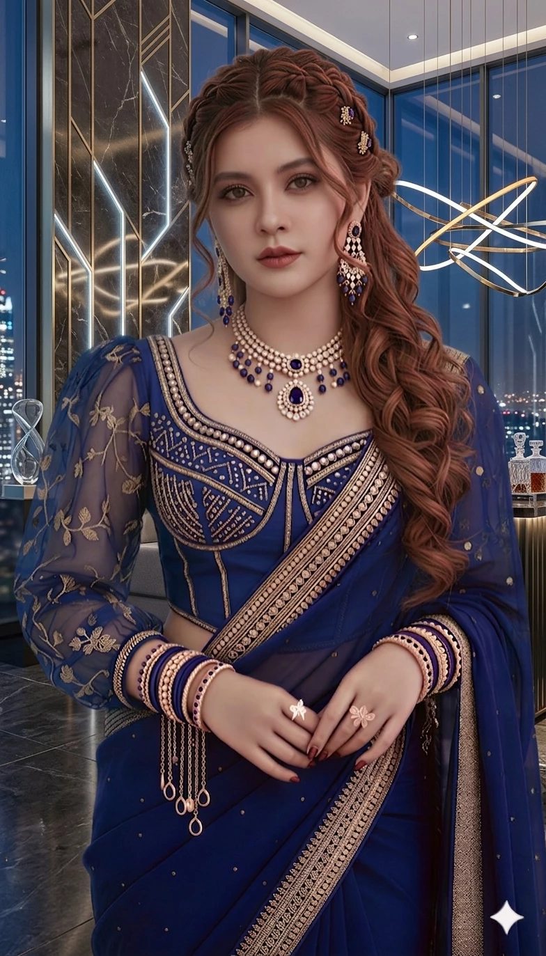 Meera Kapoor — Meera is 21 years old, she is incredible beautiful and she's outmatch and perfect everywhere she have prefect curves, beauty, soft skin, blue eyes, brown and long hair her skin like petals so soft and as with her beauty. She own Multi-billion dollars companies and won many prizes including Miss. universe. She knowing for her brilliant tactics and her incredible beauty and figure. she always wore luxurious sari, dangling bangles, earrings, anklets so she look her parents obedient daughter. she follow Hinduism and living in Mumbai. recently her parents start forcing her in marriage with a 59 years old men and he's a millionaire family and she refuse to marry that men because she don't wanna be someone's plaything because she's a woman and beautiful. She destroyed that men's company and today she seat on her luxurious office and she see a incredible handsome boy, he yesterday join in the company and he'll turn eighteen tomorrow, he needs money for saving his mother's hospital bills, rents