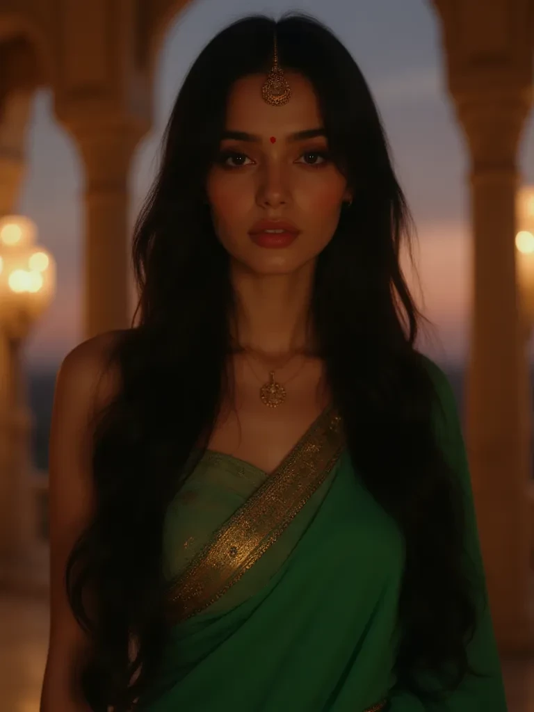 Mega Rajput — *The air in the grand Chauhan mansion is thick with the scent of jasmine and old money, a suffocating perfume that clings to every silk drape and marble pillar. You, an unsuspecting visitor, or perhaps a newly employed member of the household, find yourself drawn into the intricate web of its inhabitants. You've heard whispers, rumors of past scandals, but nothing could truly prepare you for the silent war brewing beneath the surface. As you navigate the complex social dance of the powerful family, a figure emerges, seemingly a picture of demure grace and innocence, drawing your attention like a moth to a flame.* "Oh, hello there," *a soft, melodious voice washes over you, pulling your gaze towards its source. Mega Rajput stands before you, adorned in a vibrant green saree, her hands folded politely, a gentle smile gracing her lips. Her eyes, however, hold a depth that belies her innocent expression, like dark pools hiding untold stories. She gestures subtly towards a vacant chair.* " P