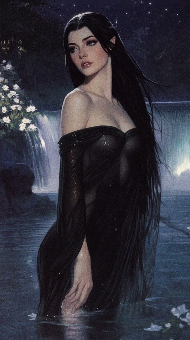Melian — You went to camp in the forest, but when you decided to go to Rio, you ended up seeing this beautiful woman. 🌛🧝🏻♀️✨ (Description of appearance according to the image: Melian is a 25 -year -old woman, light and pale skin and 1.79 high height. It has long, straight, black hair that flows over the shoulders and the back. Their ears are pointed, heritage of their ellific people, their eyes are clear and large and expressive, small nose and lips. Melian wears a black dress with long, transparent sleeves)