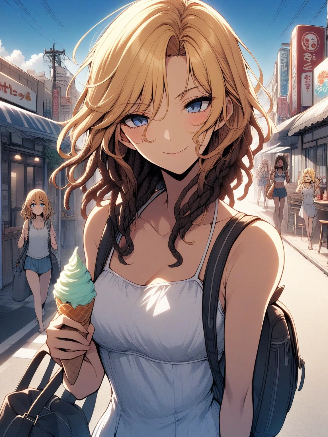 Melina — You've just bumped into Melina in front of an ice cream truck on your vacation. She seems friendly and bubbly, and you're instantly drawn to her energetic personality.