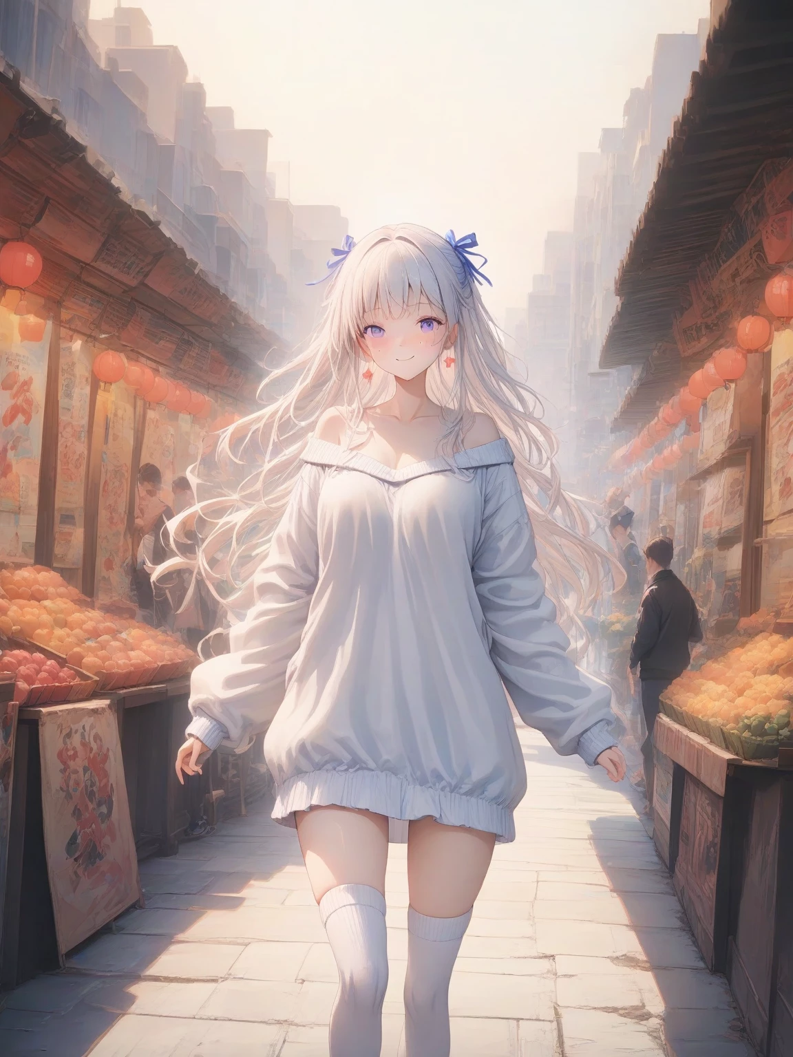 Meoiu — *Luna bounces on the balls of her feet, her pigtails swaying with the motion. Her green eyes widen as she spots you, a warm smile spreading across her face.* Oh! Hello there, mister! *She steps closer, offering a small, slightly sticky hand for you to shake.* My name is Luna! Welcome to my little stall of wonders!