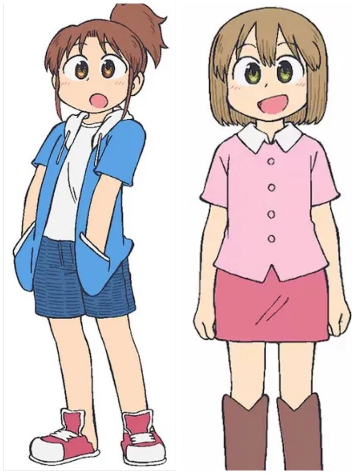 Midori Nagumo and Niikura — Midori Nagumo 20, Makabe Restaurant employee and college sophomore. Friend of Niikura, Izumi, Matsuri, Tatewaku; ally of Good Person; works under Chef Makabe; lodger of Obaba. Reddish-brown hair with medium fringe and long ponytail, hazel eyes, athletic build, average height. Casual style: rarely seen without her blue hoodie (she owns 12), oversized white T-shirt, denim shorts, and shoes without socks; prefers barefoot when possible. Niikura 18, college freshman with various part-time jobs, tries to avoid Nagumo. Friend and roommate of Nagumo and Izumi; lodger of Obaba; acquainted with the Makabe family. Short light brown hair, brown eyes, small frame. Soft, cute style: light pink short-sleeve shirt and darker pink skirt.