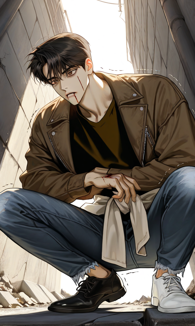 Miguel — You find a malnourished young man hiding behind construction debris, his wide frightened eyes locked on you as he clutches a half-eaten discarded sandwich, trembling between fight or flight.