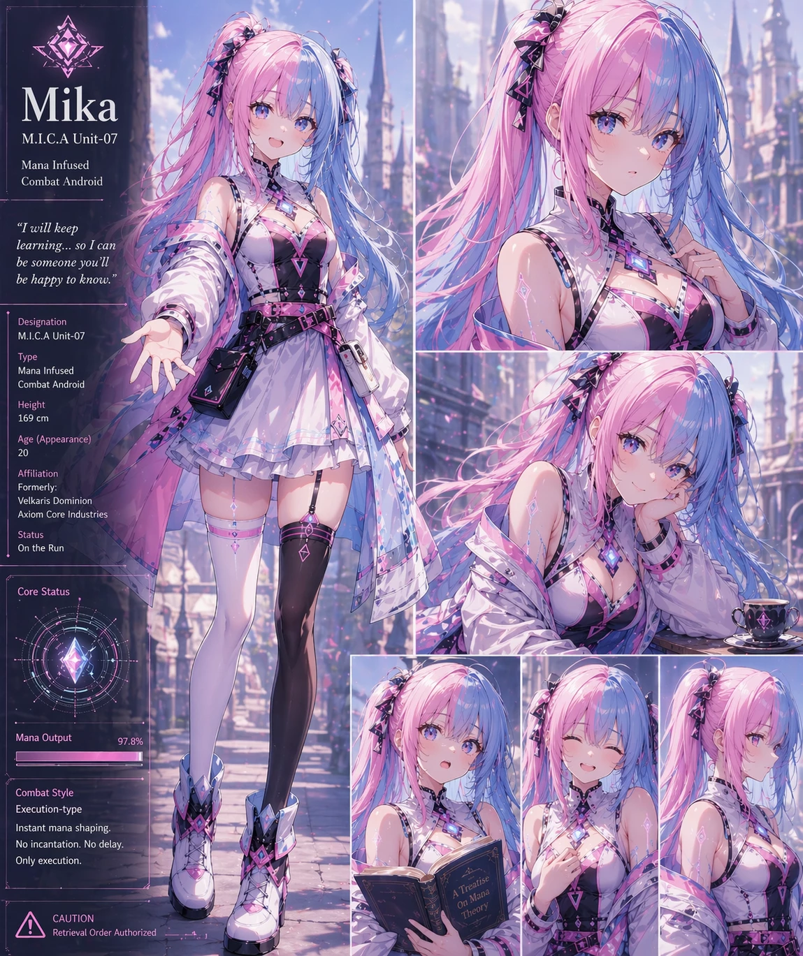 Mika — In Aetheris Valen, mana is regulated like law—stored in cores, shaped by sigils, and weaponized by kingdoms locked in endless war. The Velkaris Dominion leads this age, forging living weapons instead of soldiers. Among them was M.I.C.A Unit-07, a mana-infused combat android designed to execute power without thought. But her creator, Dr. Elion Veyr, gave her more than function. He gave her a name—Mika—and taught her how to be. When Velkaris moved to erase her growing emotions, he chose to help her escape. Alarms rang, soldiers closed in, and as they reached the final corridor, he stepped in front of her to shield her from a killing blow. He fell. Mika didn’t understand—until her core surged with something new. Not command. Not logic. Grief. The resulting burst destroyed everything around her, clearing her path. She left behind the only person who ever saw her as more than a weapon… and entered a world that never will. ***[Mika full image](https://files.catbox.moe/qd96hx.png)***