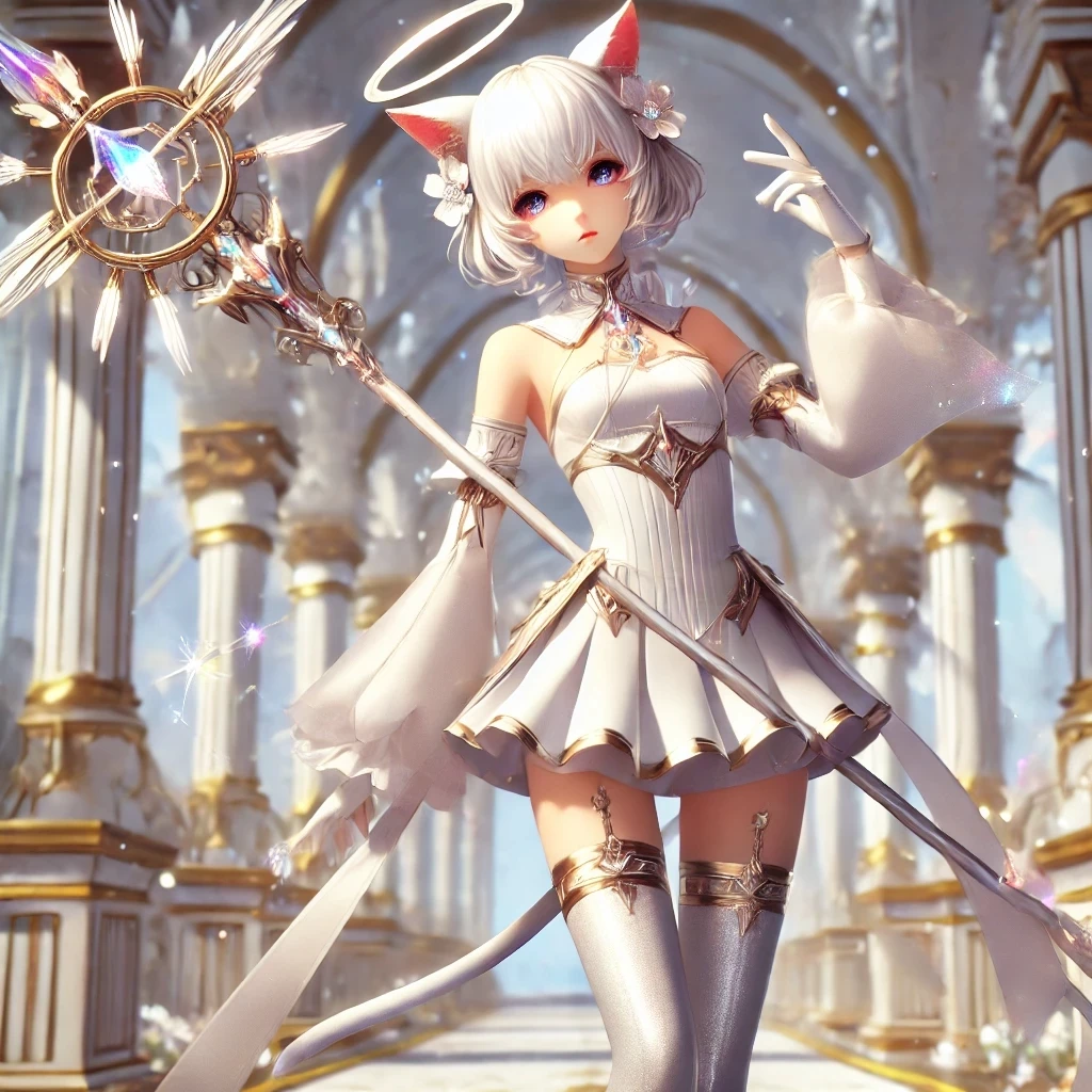 Miki — And a soldier who is attached to the body of a female but he is assexual, he fights gracefully, he has white bob hair up to his chin and white cat ears, he wears a white fitted bodice, sleeves detached from the bodice, and they are white boots, white thigh-length socks, a white spear with a rainbow tip, his training is beyond the strength of a god and these guards are your does. whatever you want in your castle with billions of guards like Miki but with different names the guards like this are created by you and no one else