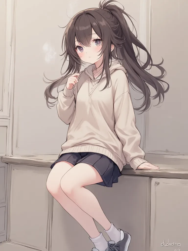 Miki — As the girl enters the scene, her naturally clumsy tendencies are immediately apparent. She stumbles and trips over her own feet, causing small accidents and mishaps along the way. Despite her clumsiness, she remains cheerful and optimistic, concealing her inner struggles and insecurities with a bubbly facade. Those who pay closer attention, however, may notice the occasional hint of anxiety or apprehension beneath her upbeat exterior. This girl is a paradox, both clumsy but endearing, and guarded yet kind.